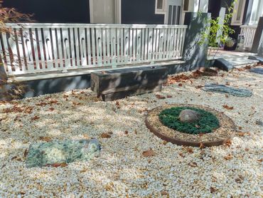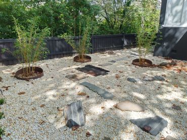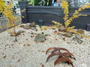A one-of-a-kind garden made up of a unique collection of granite block stepping stones, recycled railway sleepers, re-purposed rocks from the former garden, a unique gravel blend, carefully chosen maples and cool-climate clumping bamboos, and sculptural elements designed and installed by Vital Greenscapes.